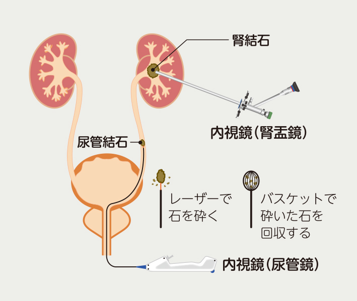 尿道より細い内視鏡を入れて、尿管結石にホルミウムYAGレーザーを照射して破砕します(TUL)。破片は鉗子で体外に取り出すか、砂状になるまで細かく破砕することにより自然排出を促します。腎結石の場合は、柔らかい尿管鏡を使用します(f-TUL)。どちらの場合も、治療後に尿管ステントを留置することがあり、通常は1〜2週後の外来で抜去します。TUL/f-TULは、体外衝撃破砕術(ESWL)が苦手とする硬い結石や大きな結石、複数個の結石、下腎杯結石などに対しても有効であり、破砕効果の高い方法です。