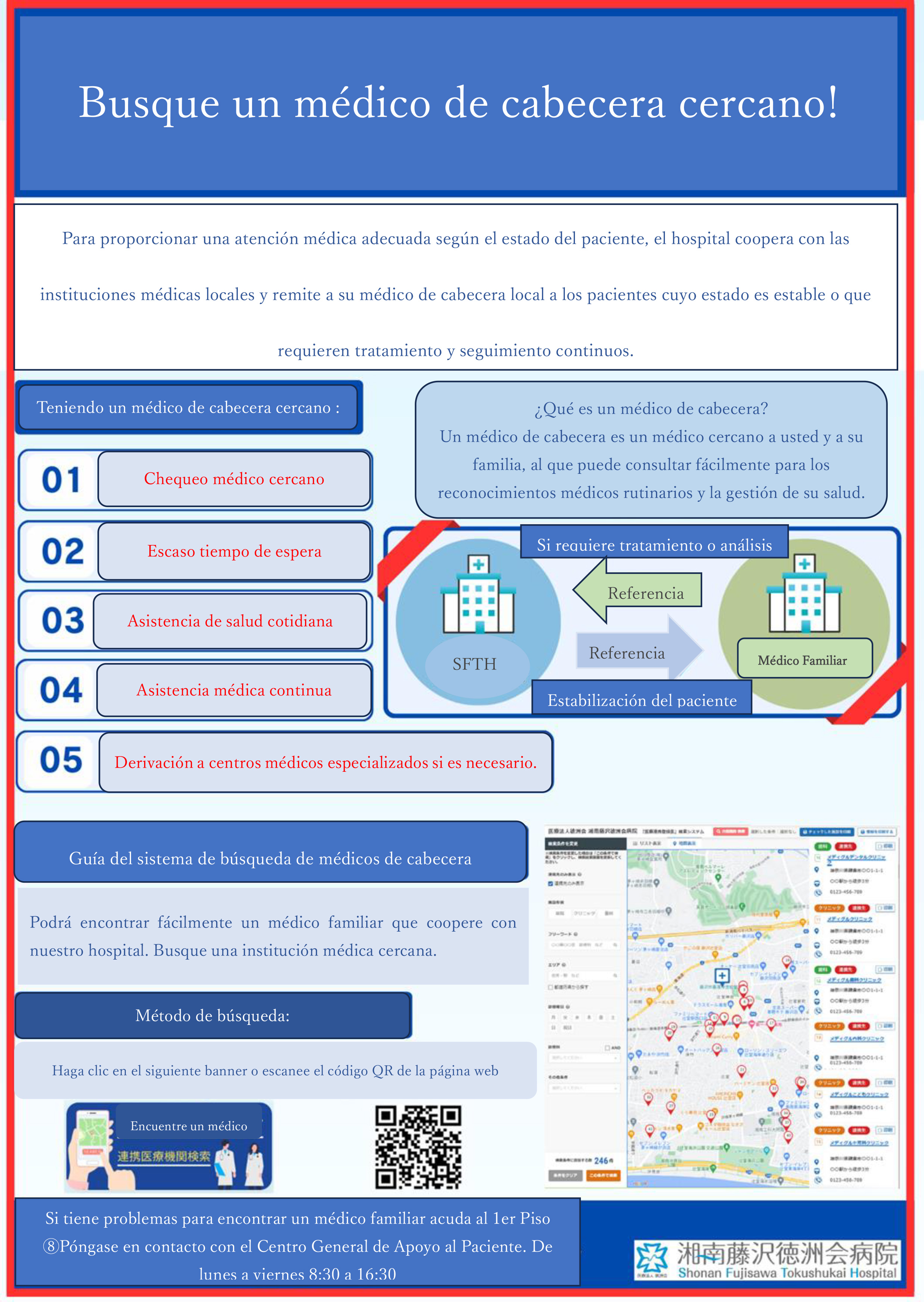 * Para los pacientes recurrentes, por favor traiga su tarjeta de seguro, la tarjeta My Number, la tarjeta de identificación del hospital o el Certificado de Elegibilidad del Seguro Médico, y su hoja de cita.
