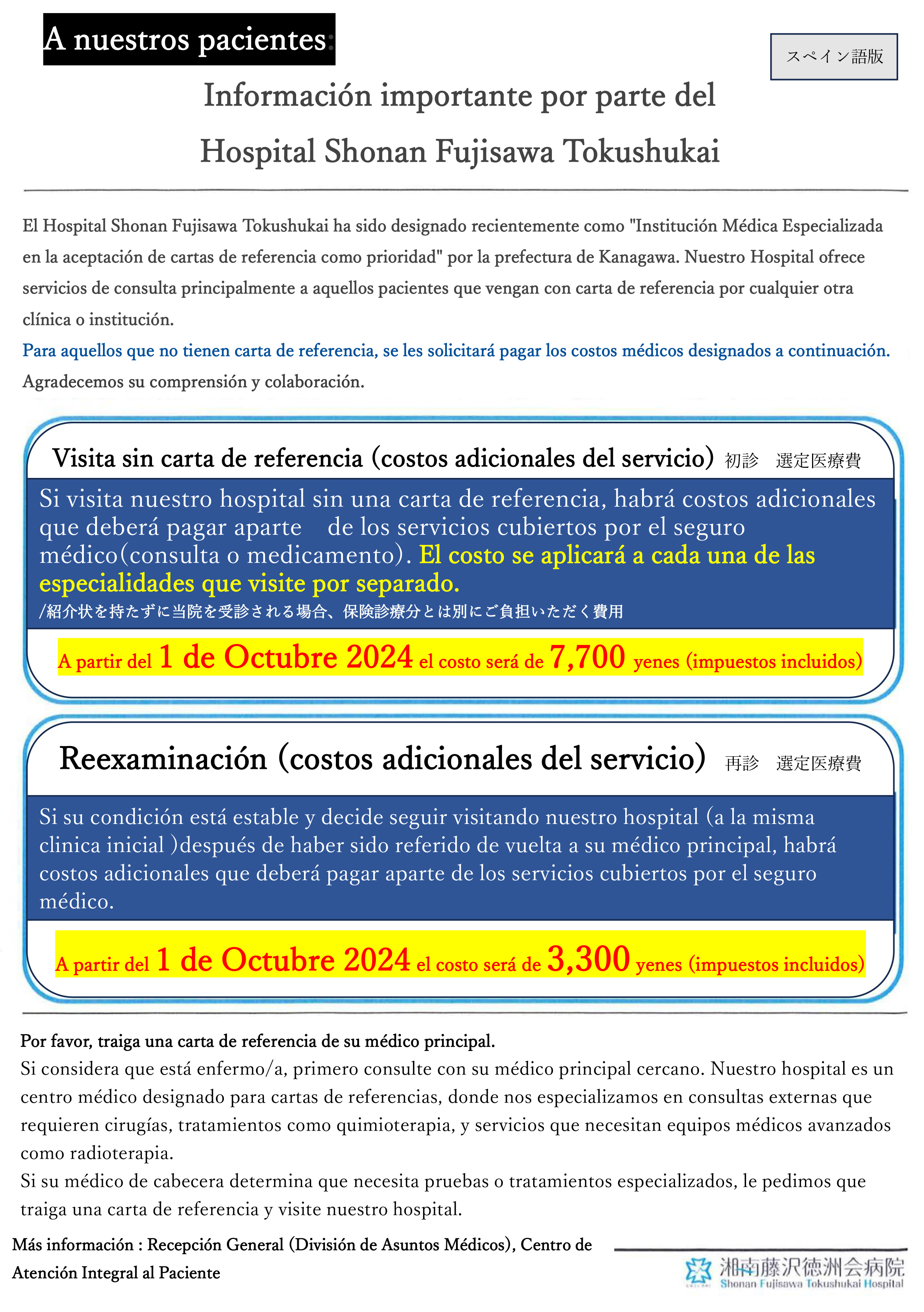 Si visita nuestro hospital sin una carta de derivación, deberá pagar una tarifa adicional de 7,700 JPY (impuestos incluidos), además del costo cubierto por su seguro.
